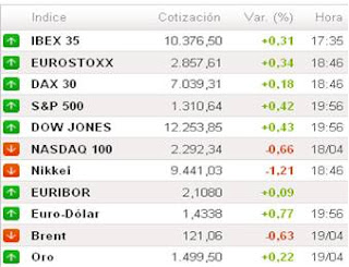 ESPAÑA. EL IBEX FRENA SU 5% DE CAÍDA: La jornada se saldó con una tregua en el conjunto de los mercados. Los excesos bajistas de ayer dieron paso a tímidos rebotes. El freno en el rally del riesgo país alivió a Santander y BBVA, y sus avances impulsaron un 0.31% a un Ibex que se había desinflado un 5% en las seis sesiones anteriores. El Ibex finalmente remontó un 0.31%, hasta los 10,376.5 puntos.